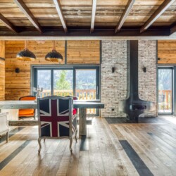 The open-plan living spaces are spacious and welcoming, presenting the perfect place to socialise and unwind after a long day on the slopes. Relax on the wide, sumptuous Chesterfield sofa and exceptional high back chair, in front of the warm fireplace, as you gaze out to the breath-taking snowy mountain views in front of you. Adjoining this space, the dining area features an imposing wooden table to host the evening’s banquet prepared by your spectacular chefs. With four comfortable armchairs surrounding the table, take a seat and enjoy some of the finest food in the Alps in complete comfort.