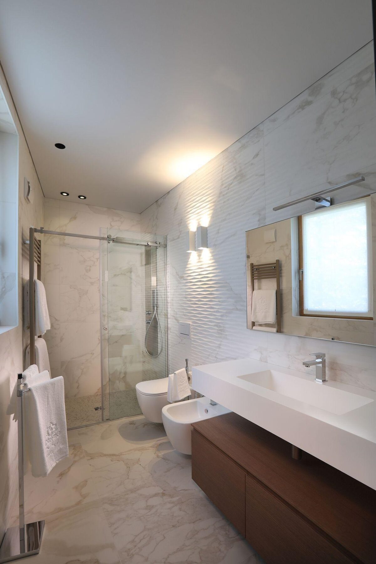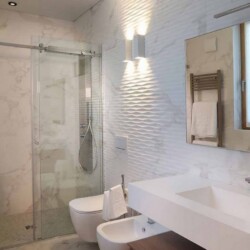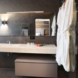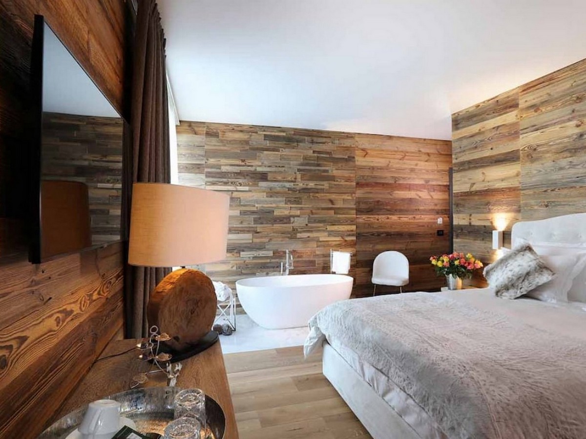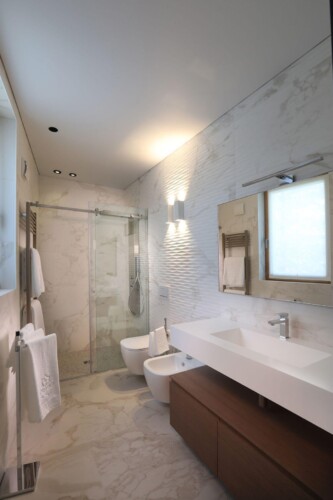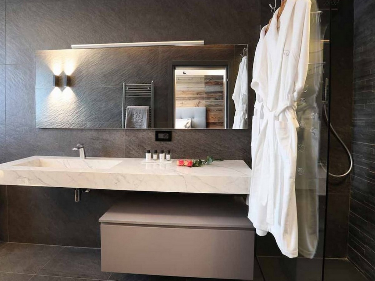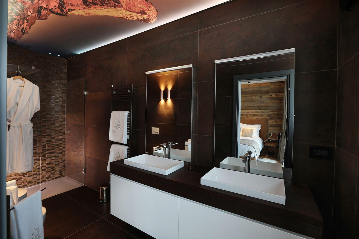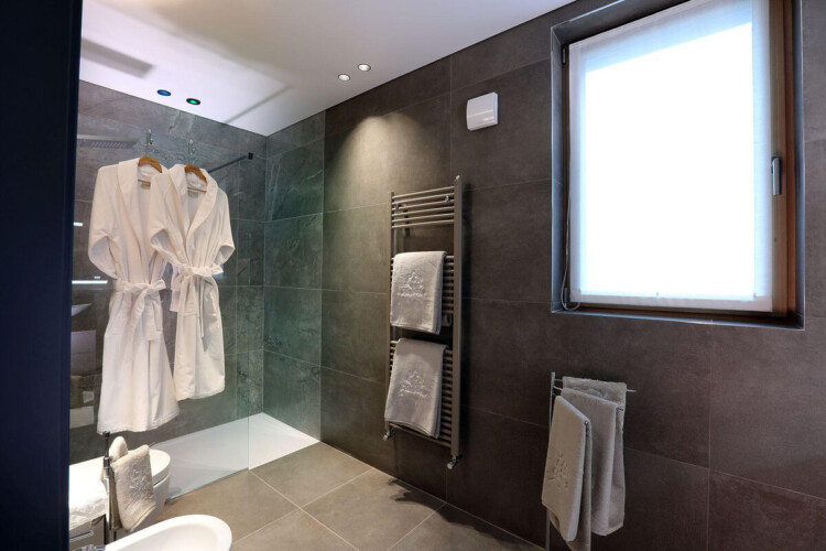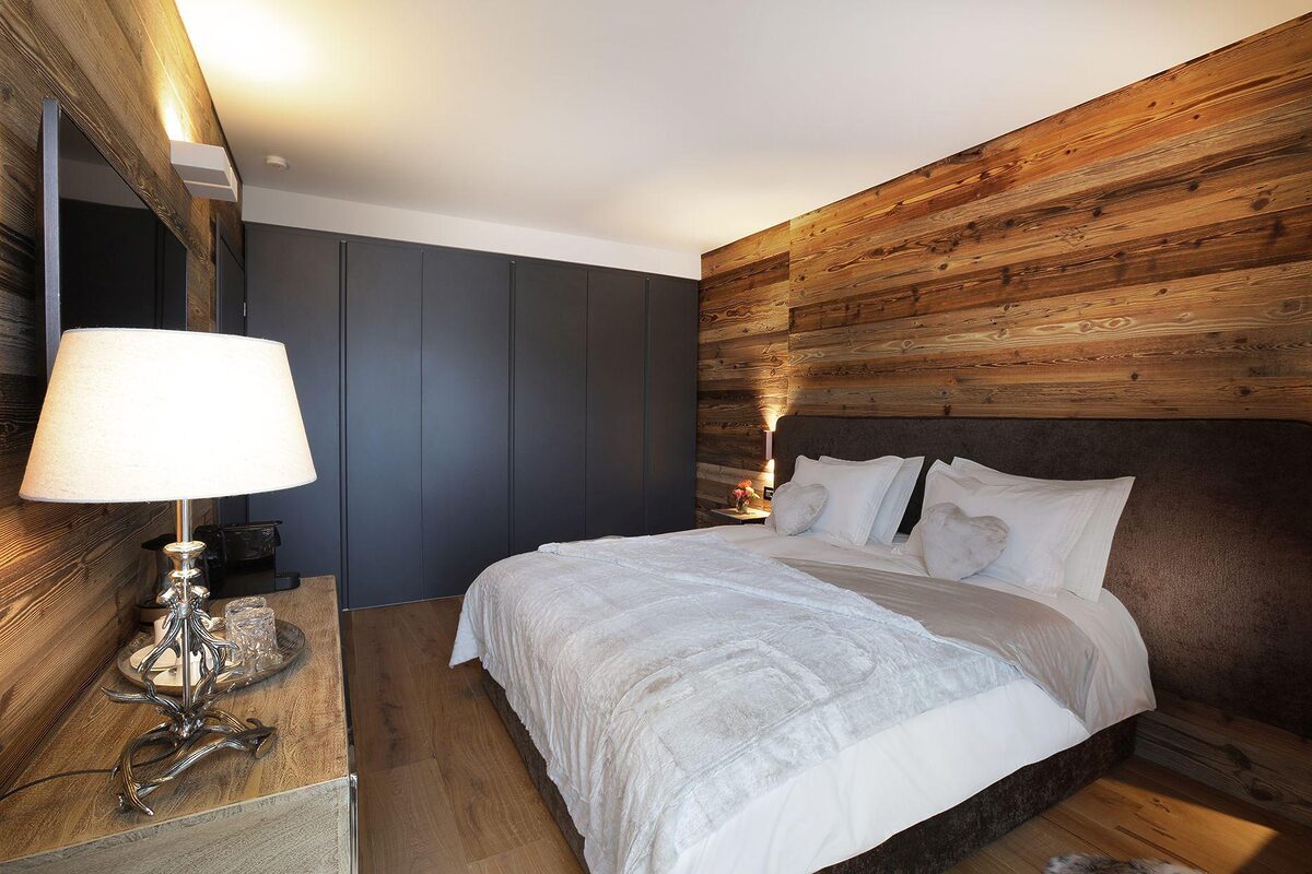 Chalet accommodates 10 adults and two children across five en-suite bedrooms. A double/twin bedroom on the first floor has a private balcony and bathroom with a hydromassage shower. Two more twin/double bedrooms with private balconies and hydromassage showers are located on the second floor along with a double bedroom featuring a free-standing Corian bathtub. The fifth bedroom, also located on this level, has a double bed, double sofa bed and a seating area.