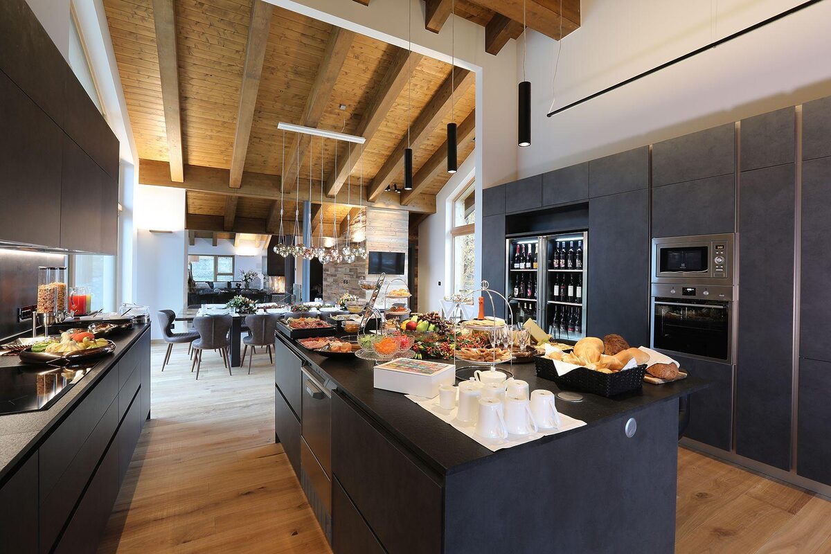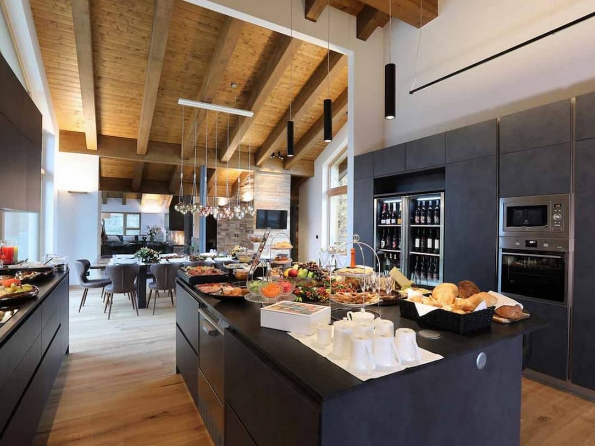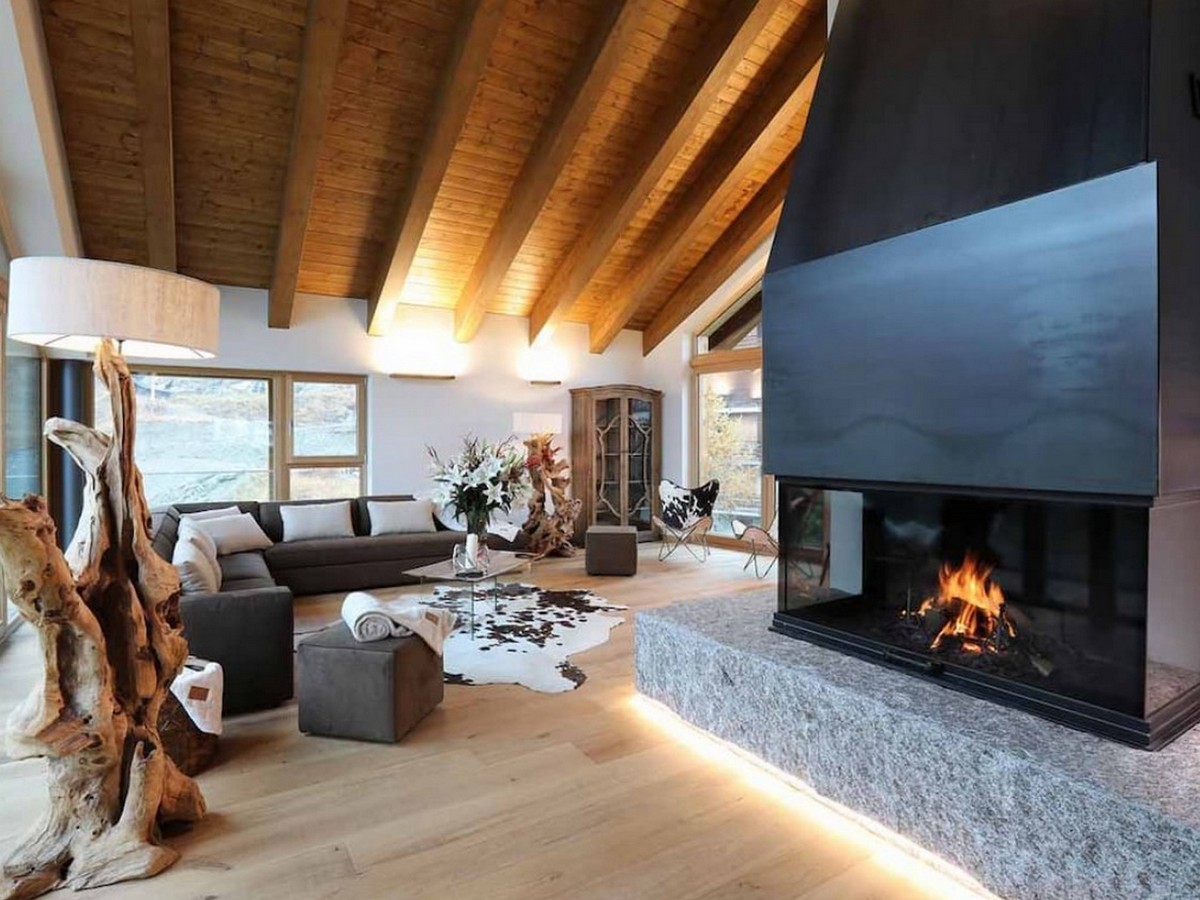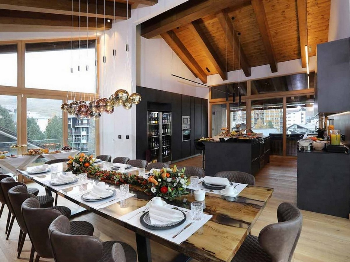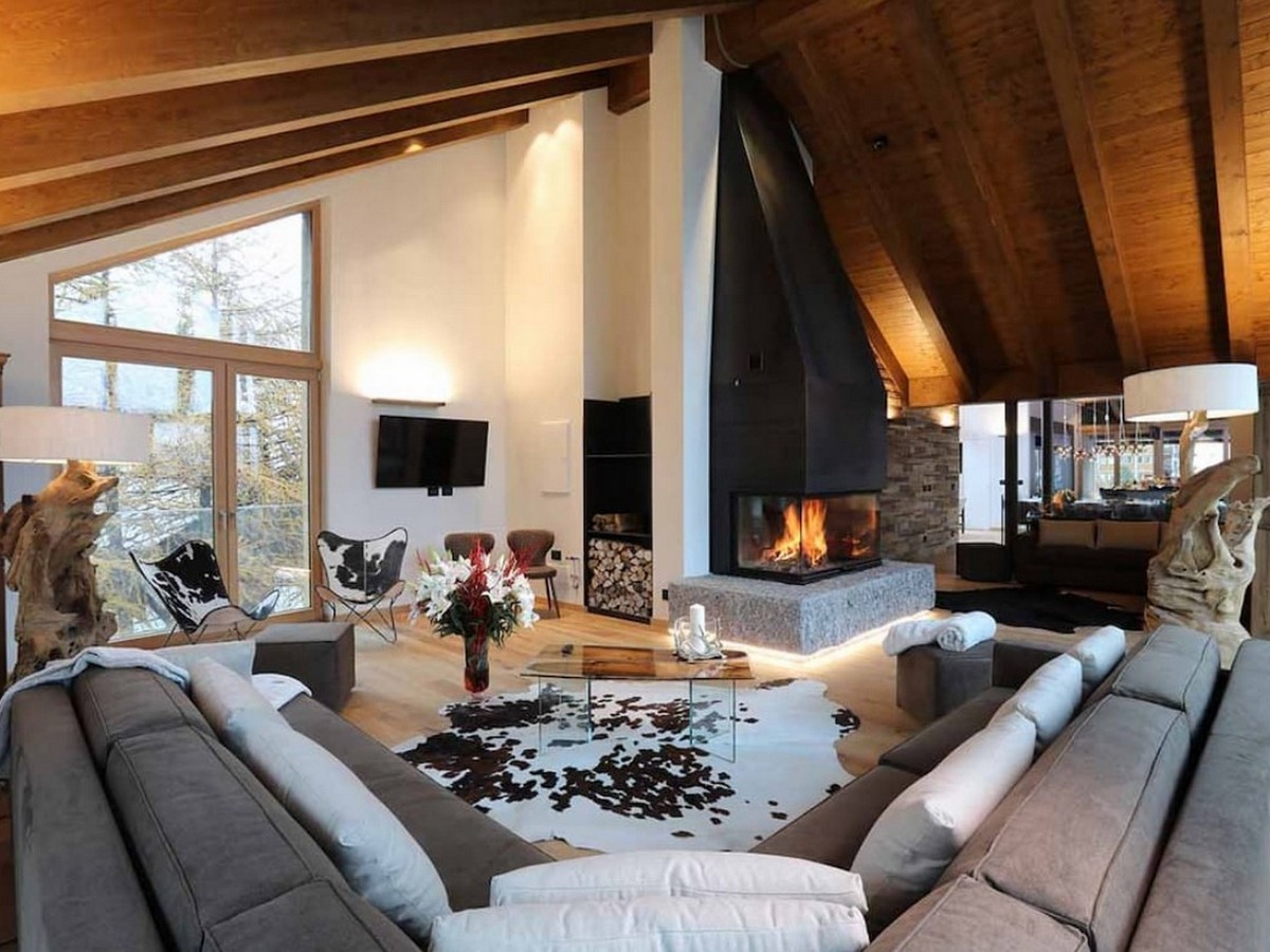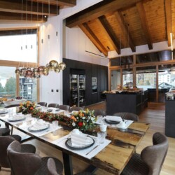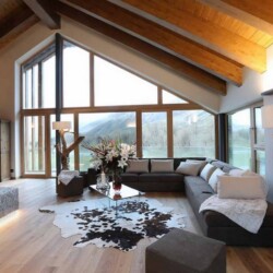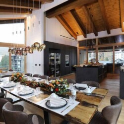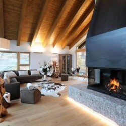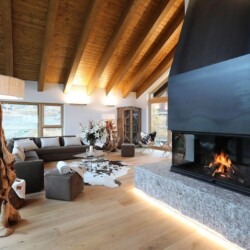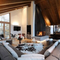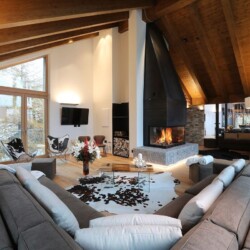 Set over four floors connected by an elevator, the chalet is accessible to those with disabilities. As you enter the chalet on the first floor you are greeted by a cosy lounge with a bioethanol fireplace. You will find the main living area on the top floor of the chalet. With windows over six metres high, comfortable sofas, a fireplace and TV, this is certainly an impressive spot to relax after a day on the slopes.