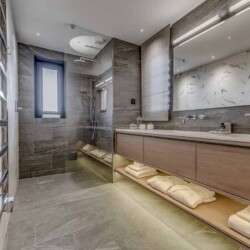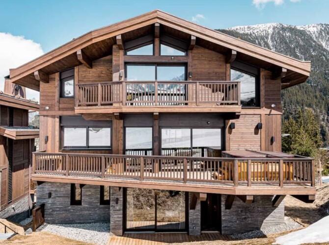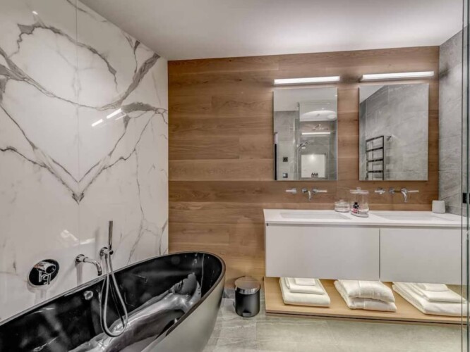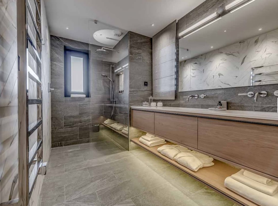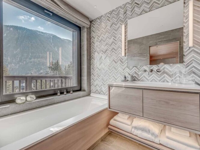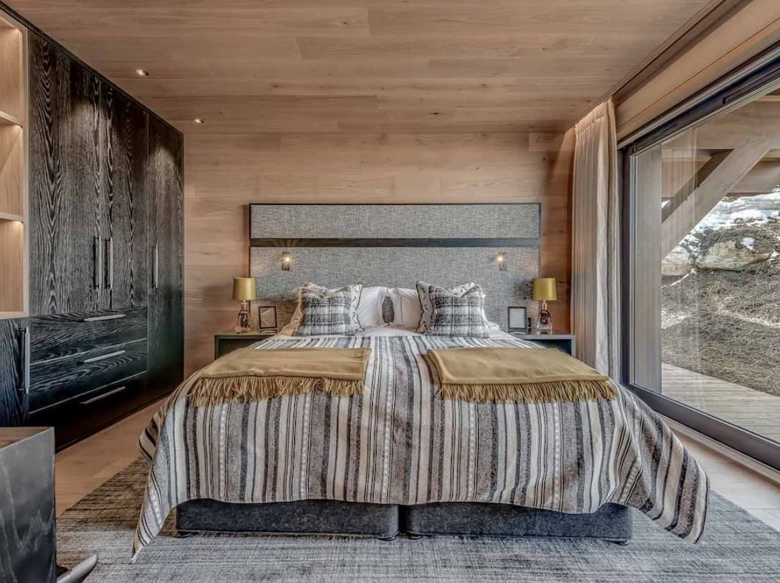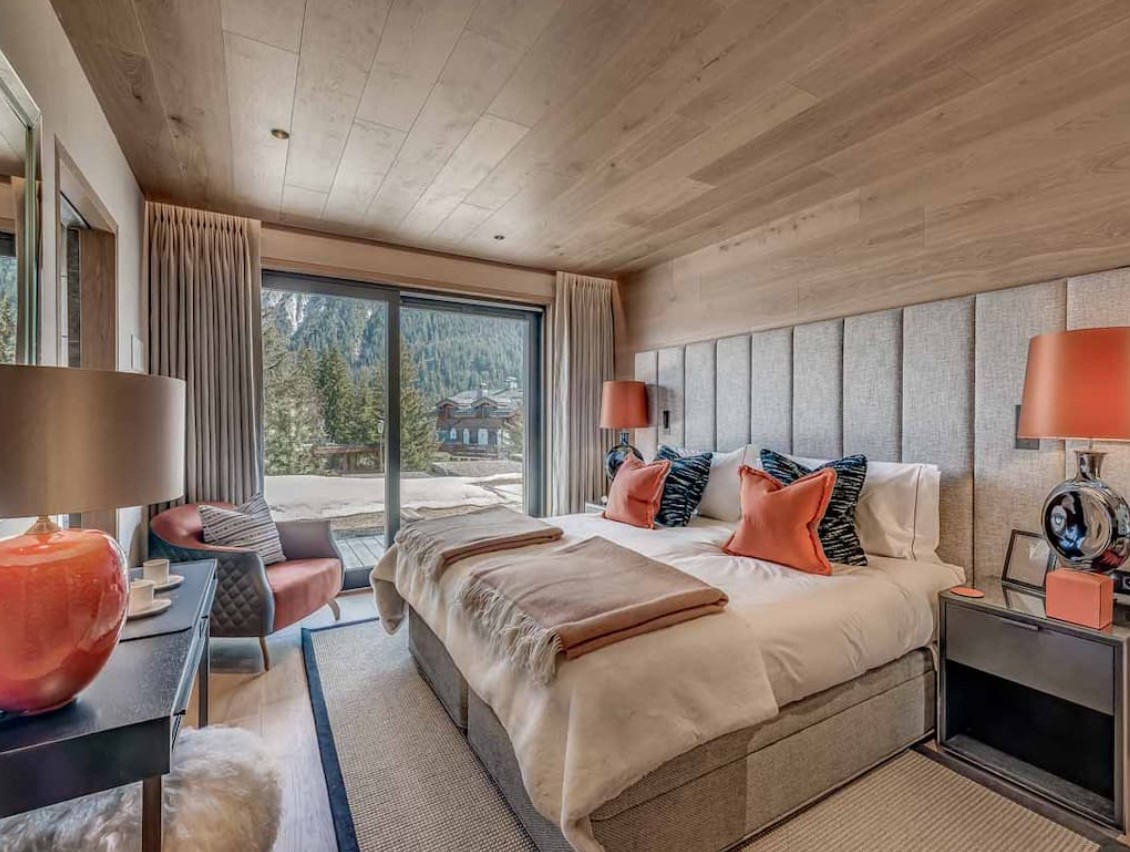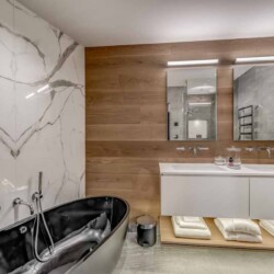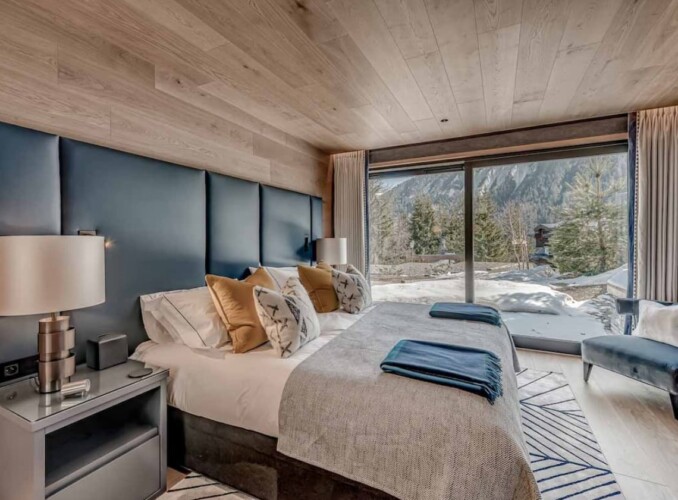 Seven sumptuous suites accommodate 14 guests. The large master suite on the top floor has its own private balcony. There are a further six en-suite double bedrooms divided between the first and ground floor levels of the chalet. The rooms all have access to an en-suite bathroom or shower room as well as a balcony or terrace.