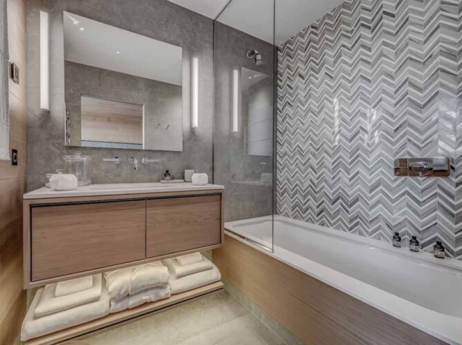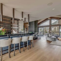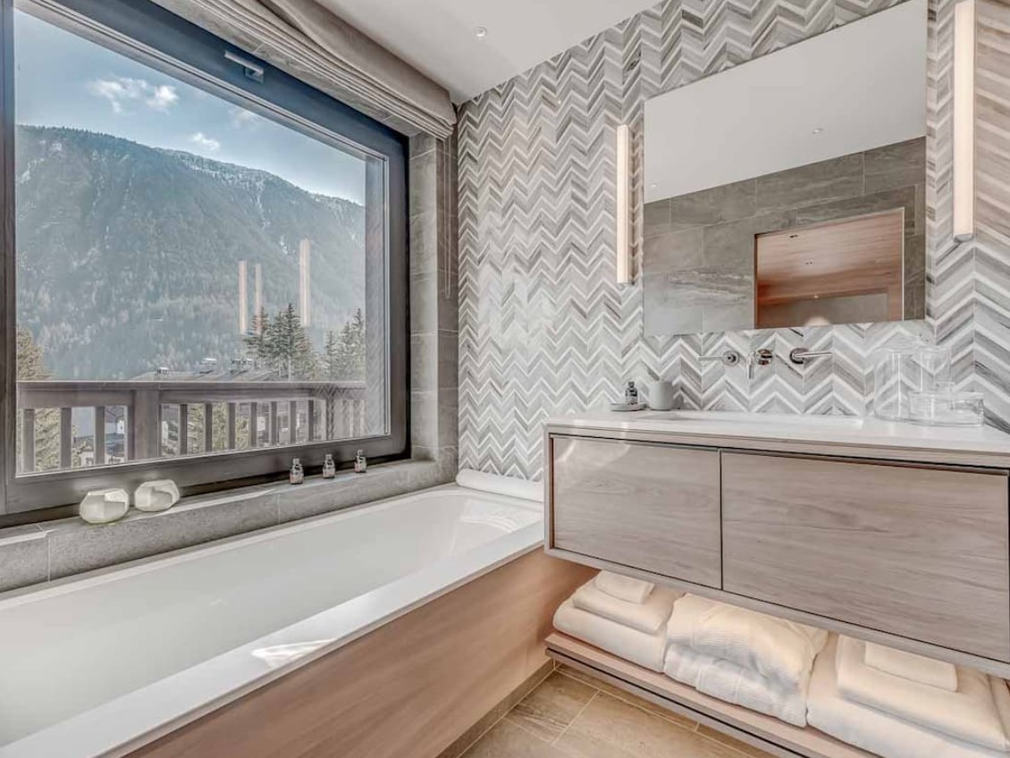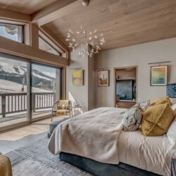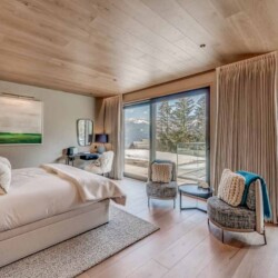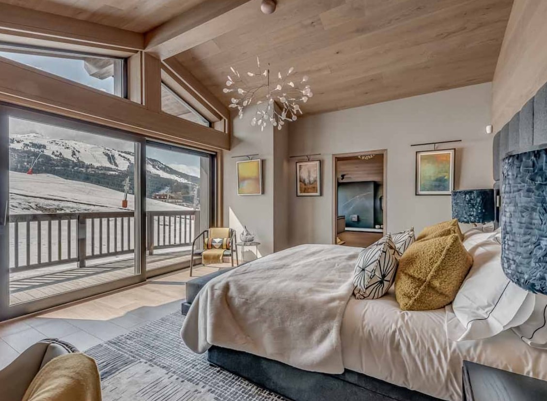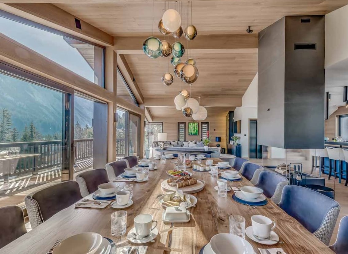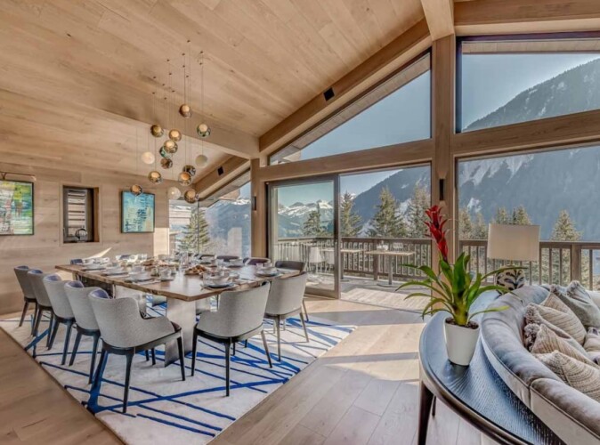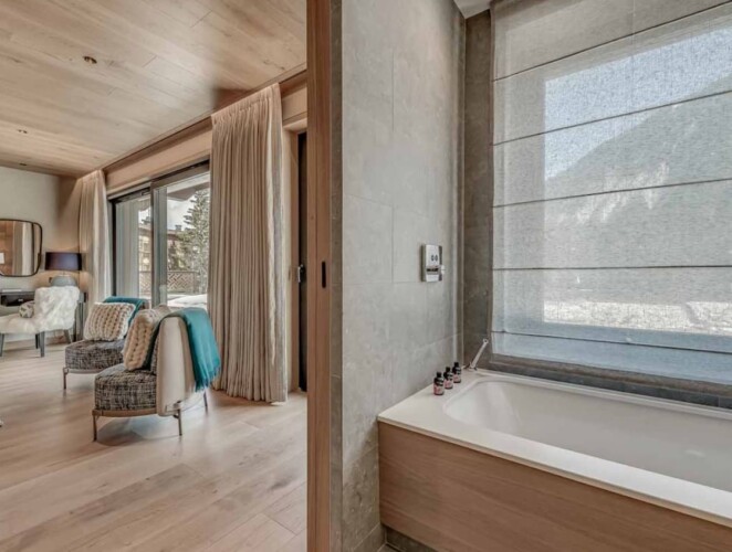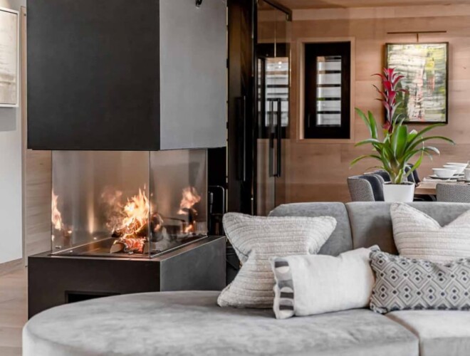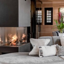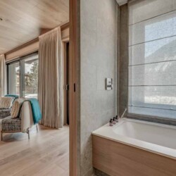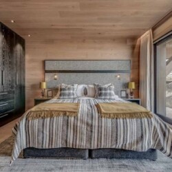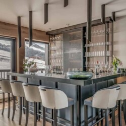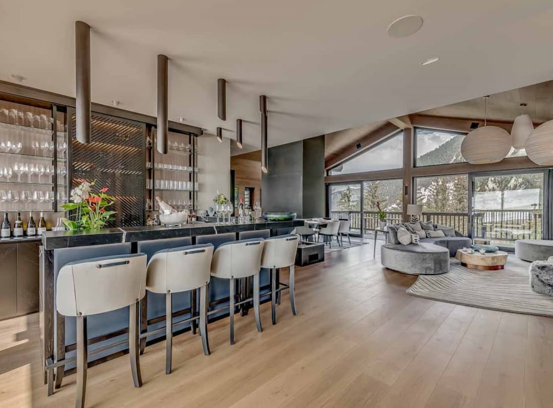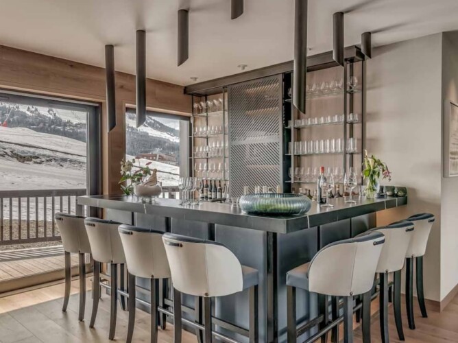 After skiing s7traight back to the chalet, you can leave your skis and boots in a spacious ski room with heated boot warmers on the ground floor, before taking the elevator up to the main double-height living area on the second floor. Here you will find a stylish seating area and dining table set around a central contemporary fireplace. Full length glass windows offer panoramic mountain views and there are balconies on both sides. An après-ski tipple awaits at the bar and there is a well-equipped kitchen too.