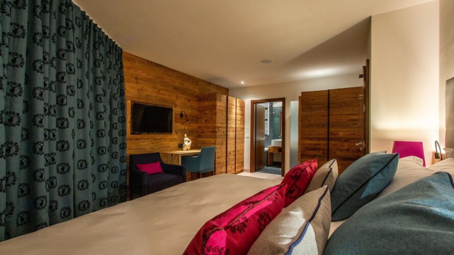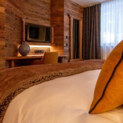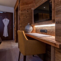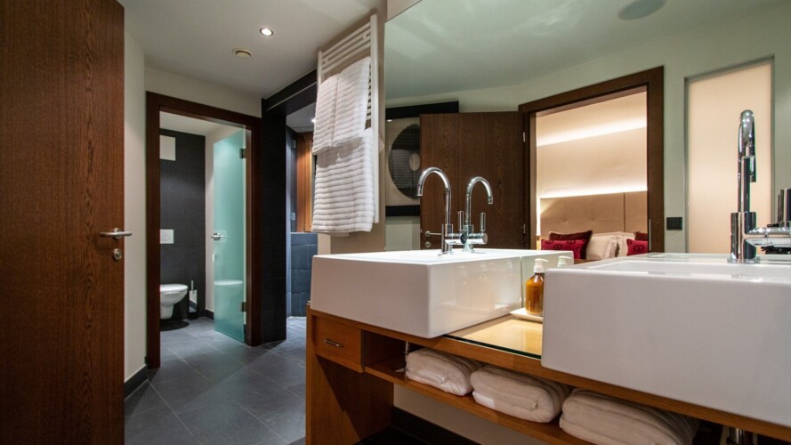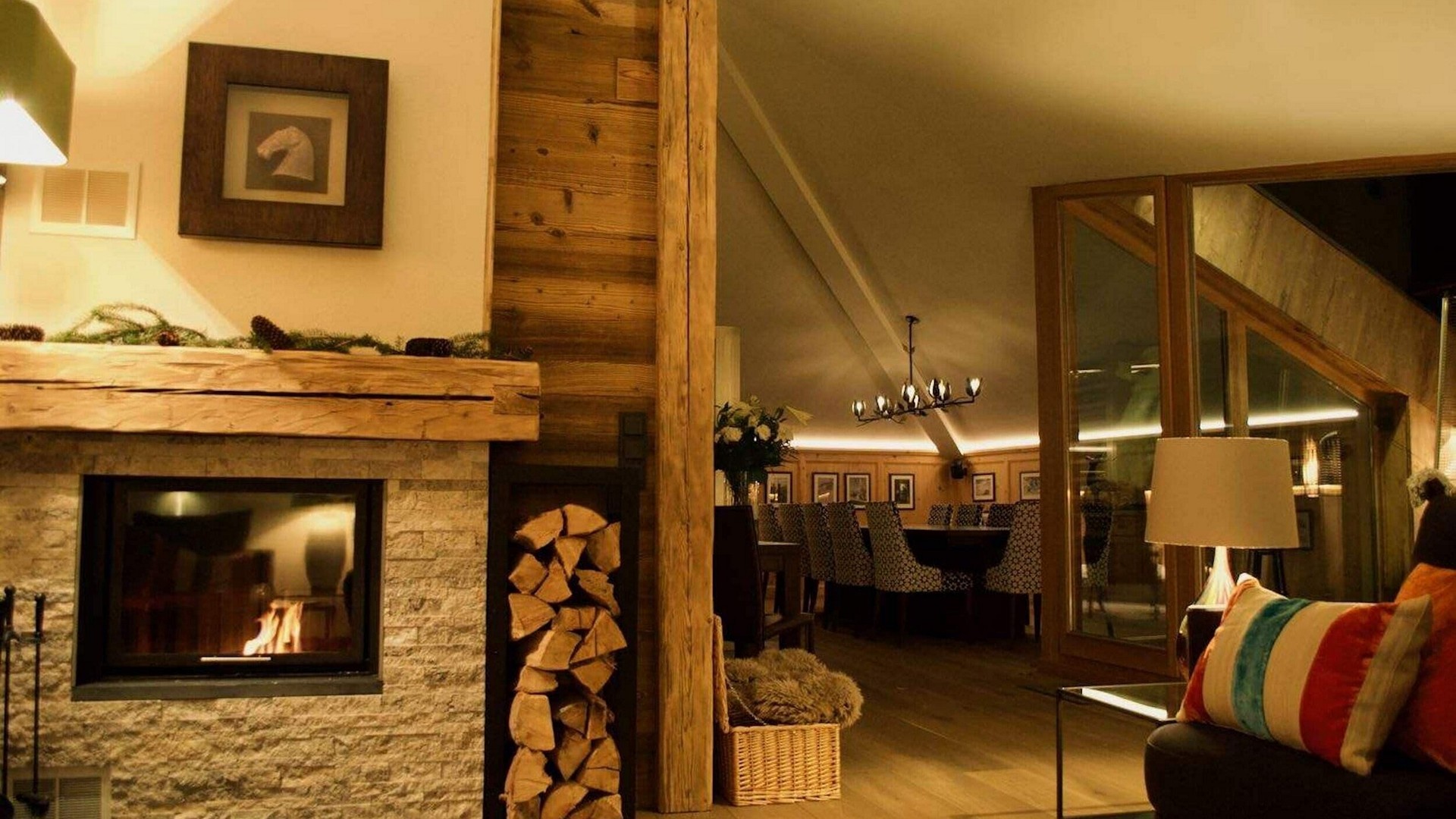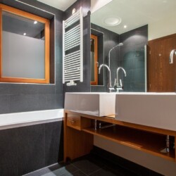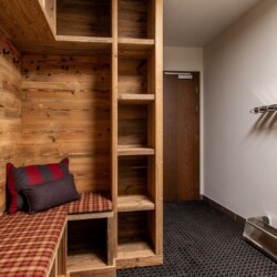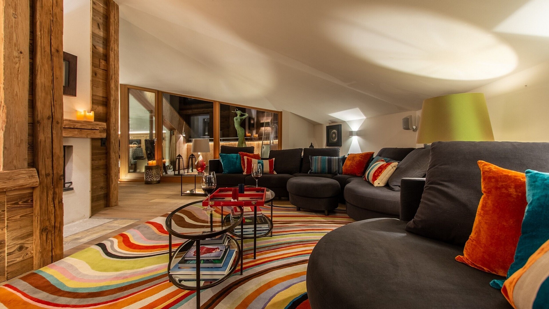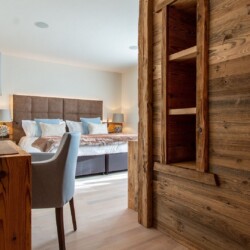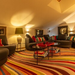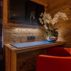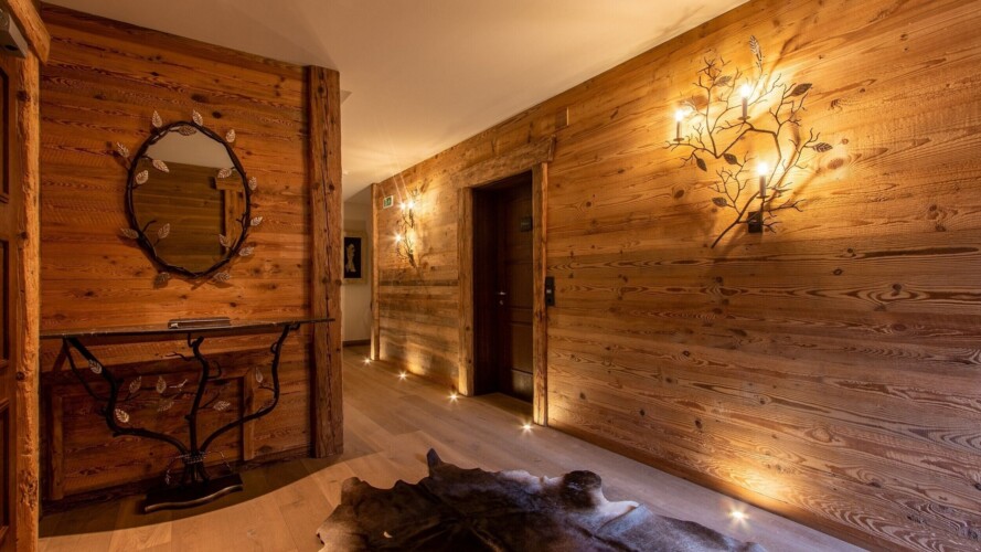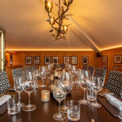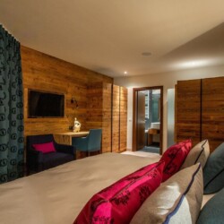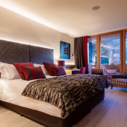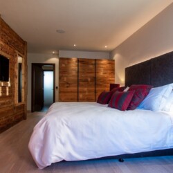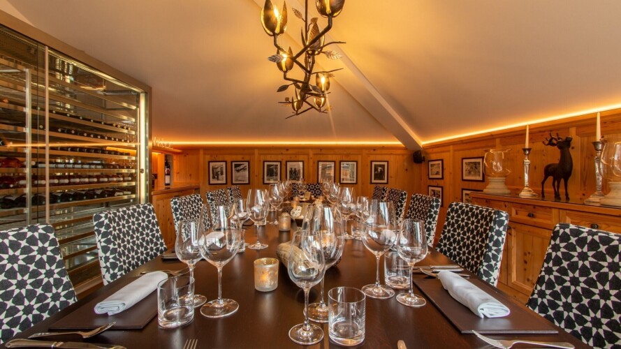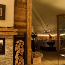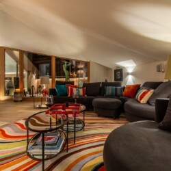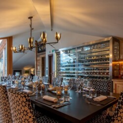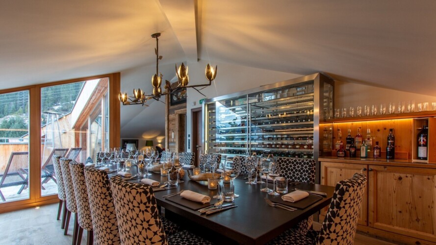 The main living area occupies the uppermost floor, providing wonderful views over the rooftops to the snow-capped mountains. Take the lift to the top and you’ll discover a bright lounge with modular sofa seating around a blazing wood fire and a stylish dining room with bar area and an impressive wine wall. Both open onto a romantic rooftop terrace that delivers wonderful mountain views.