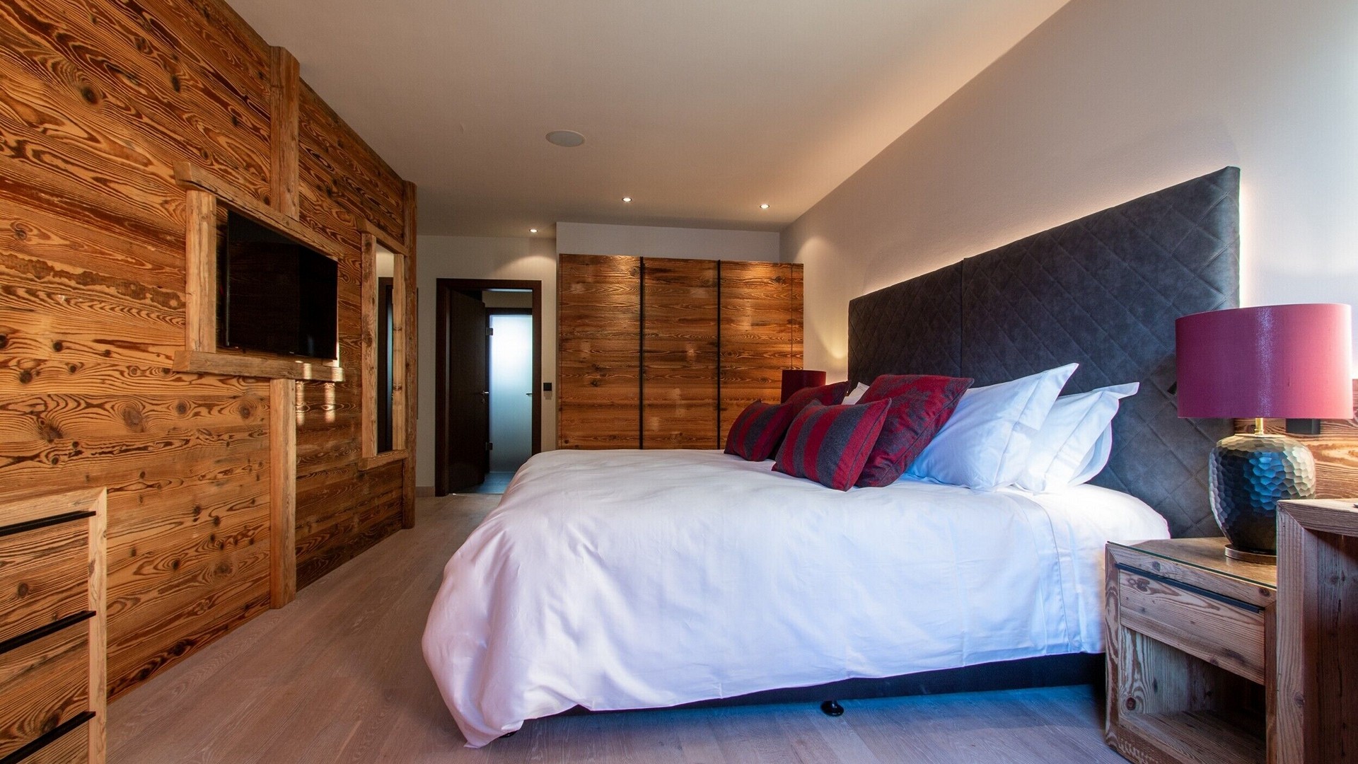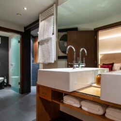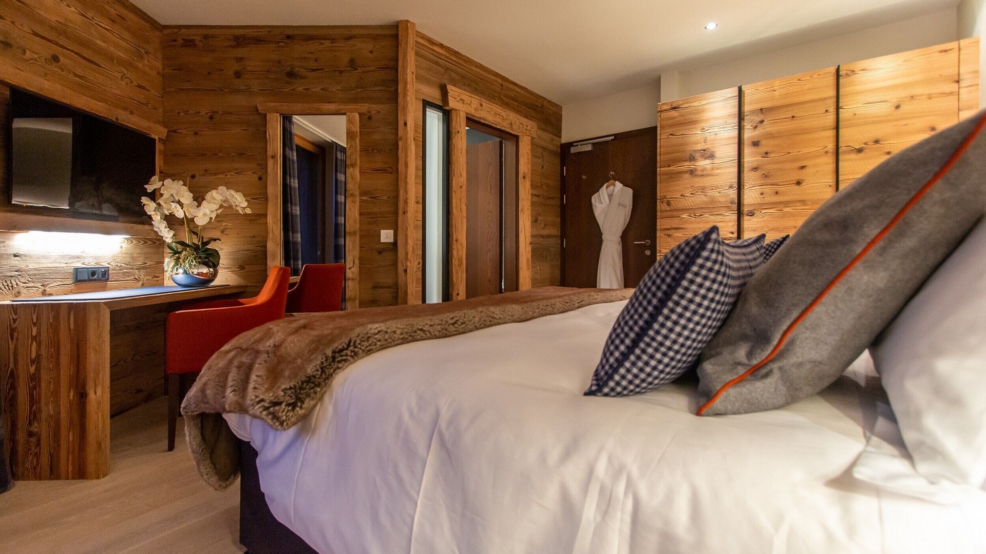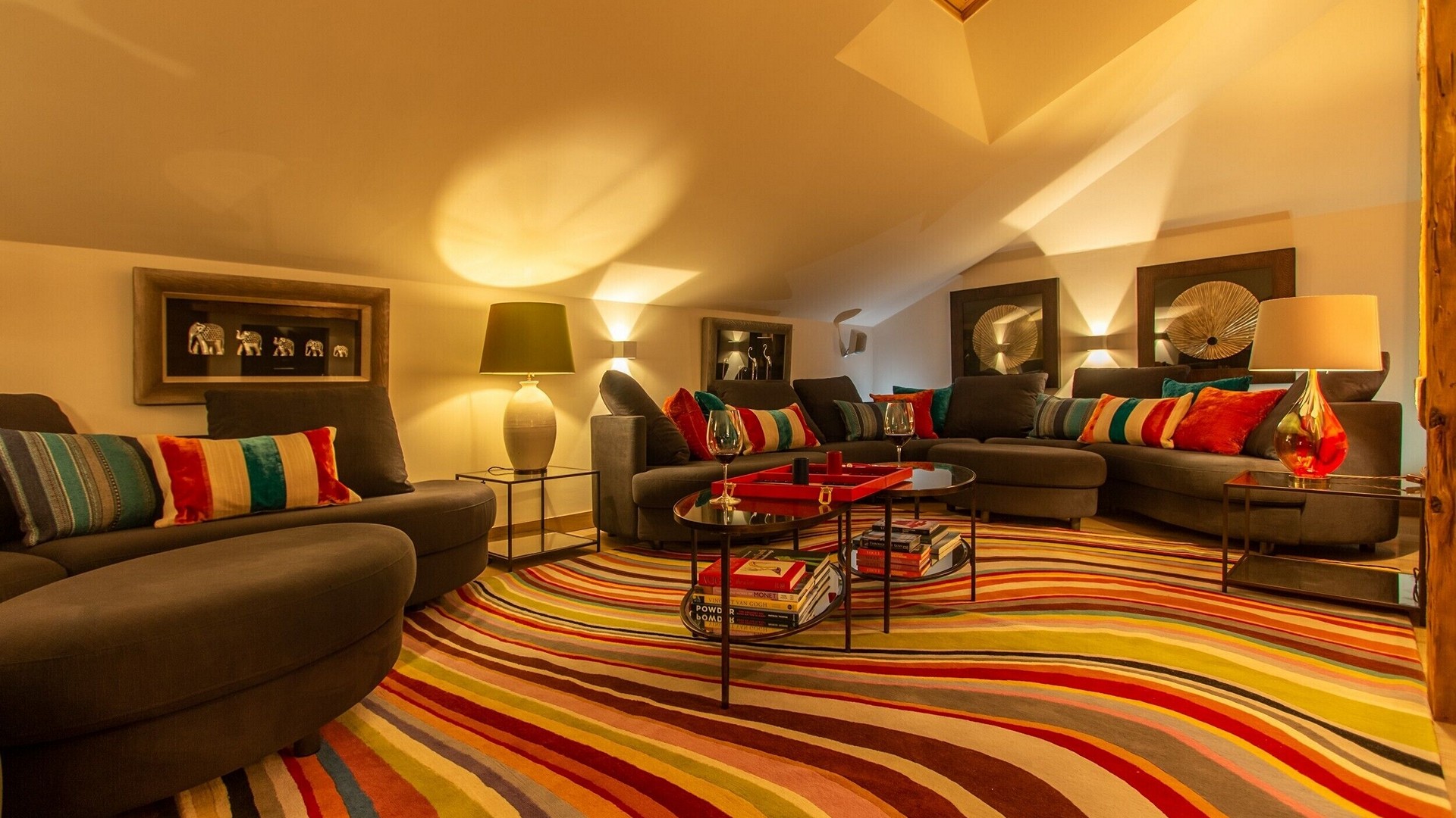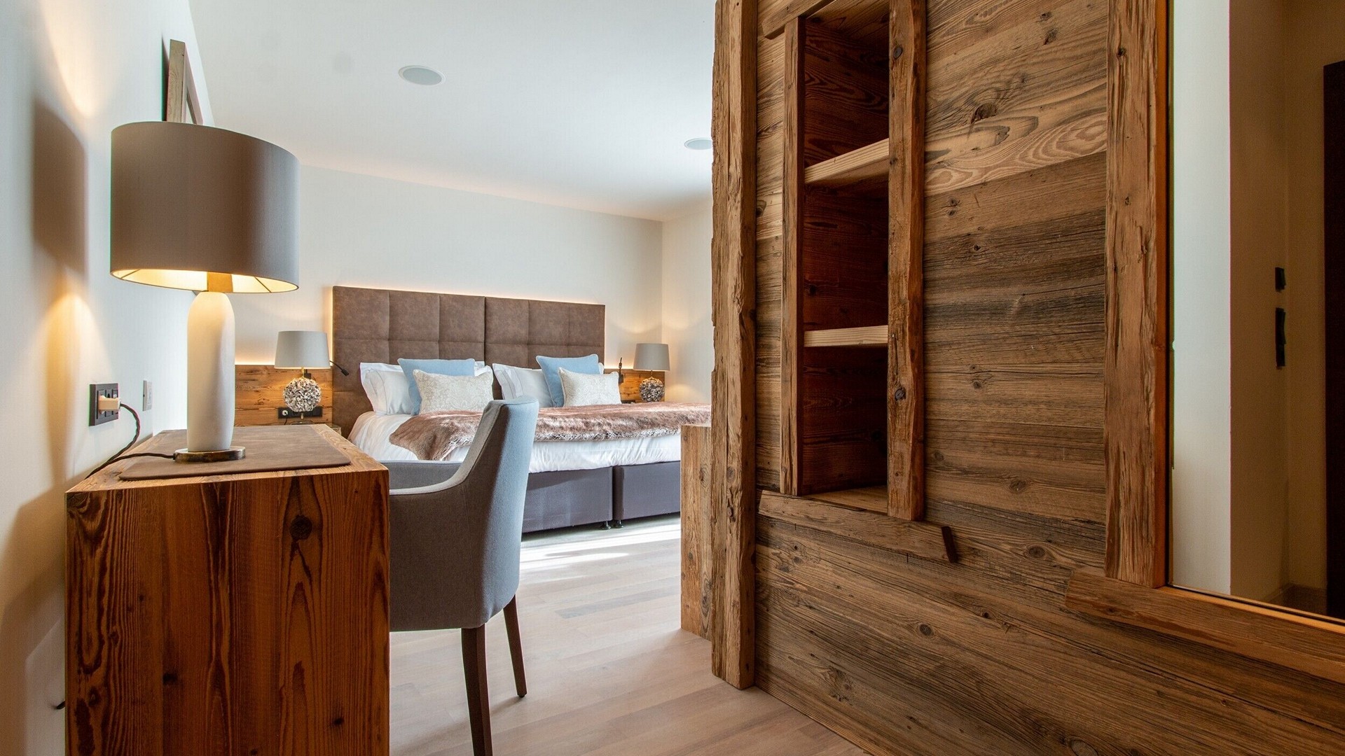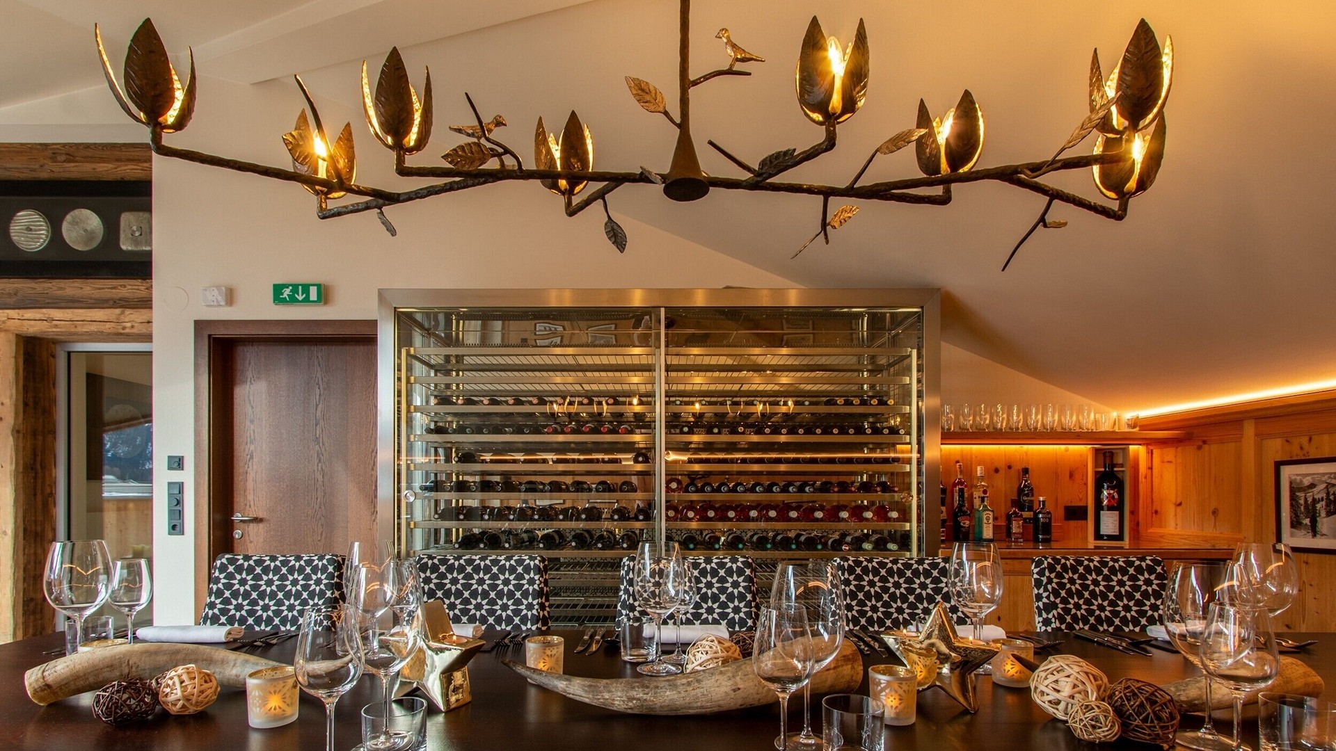 The main living area occupies the uppermost floor, providing wonderful views over the rooftops to the snow-capped mountains. Take the lift to the top and you’ll discover a bright lounge with modular sofa seating around a blazing wood fire and a stylish dining room with bar area and an impressive wine wall. Both open onto a romantic rooftop terrace that delivers wonderful mountain views.