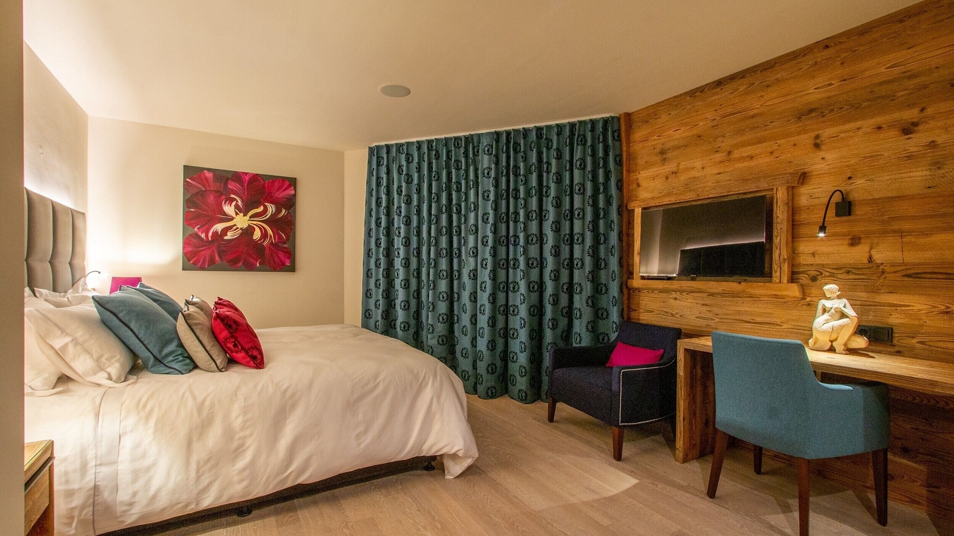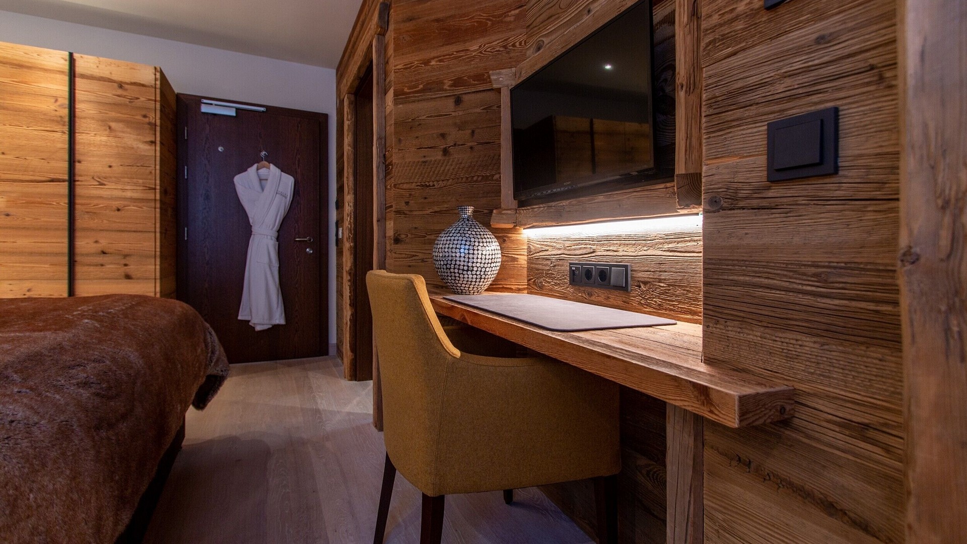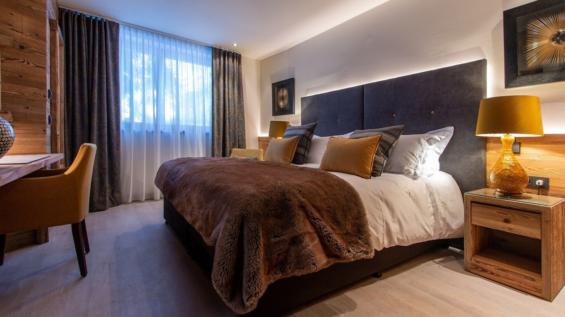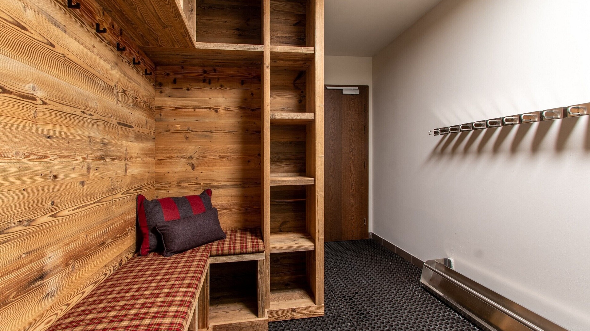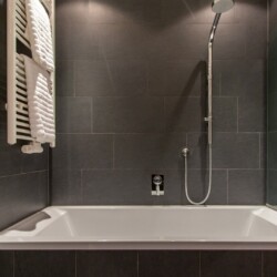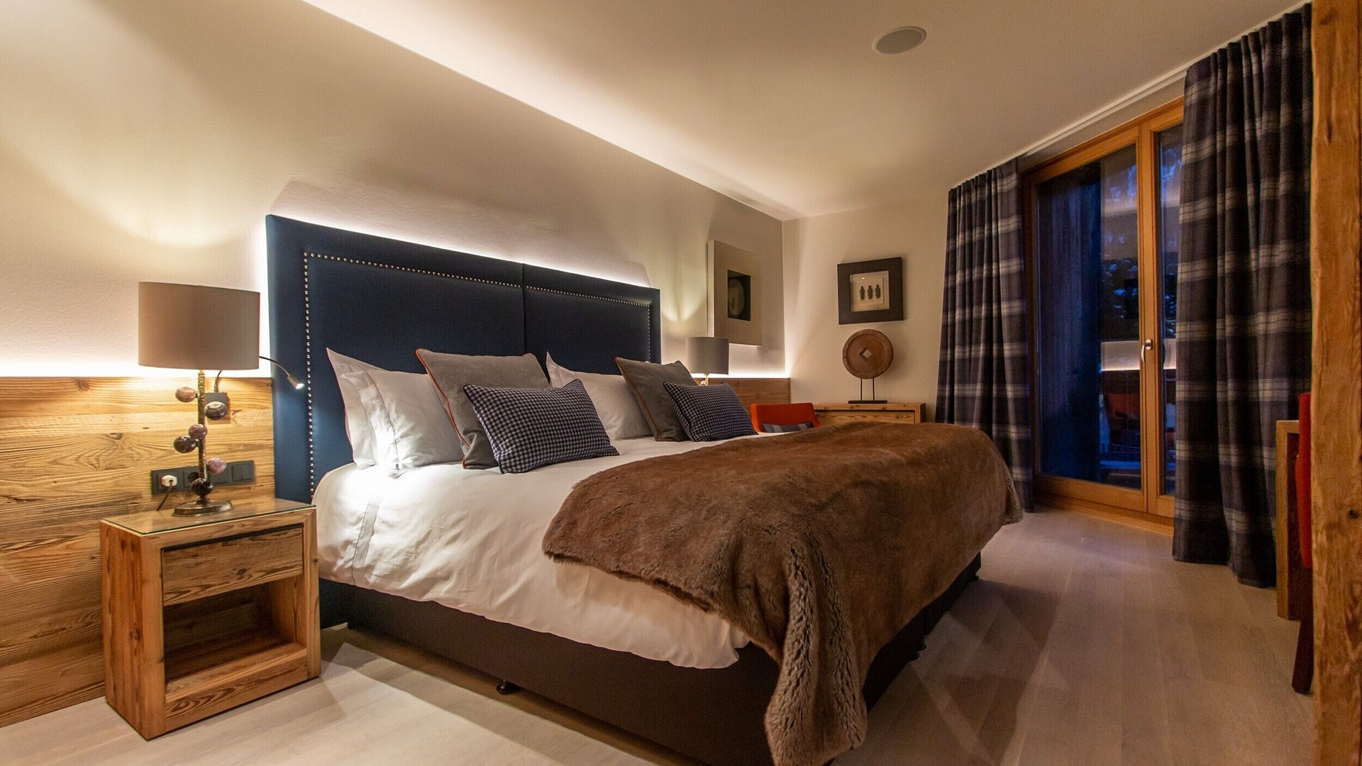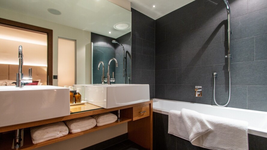 The main living area occupies the uppermost floor, providing wonderful views over the rooftops to the snow-capped mountains. Take the lift to the top and you’ll discover a bright lounge with modular sofa seating around a blazing wood fire and a stylish dining room with bar area and an impressive wine wall. Both open onto a romantic rooftop terrace that delivers wonderful mountain views.