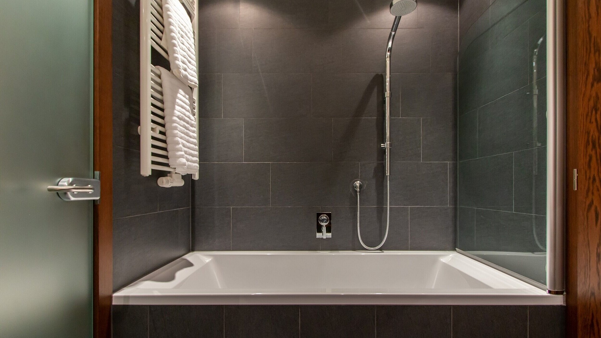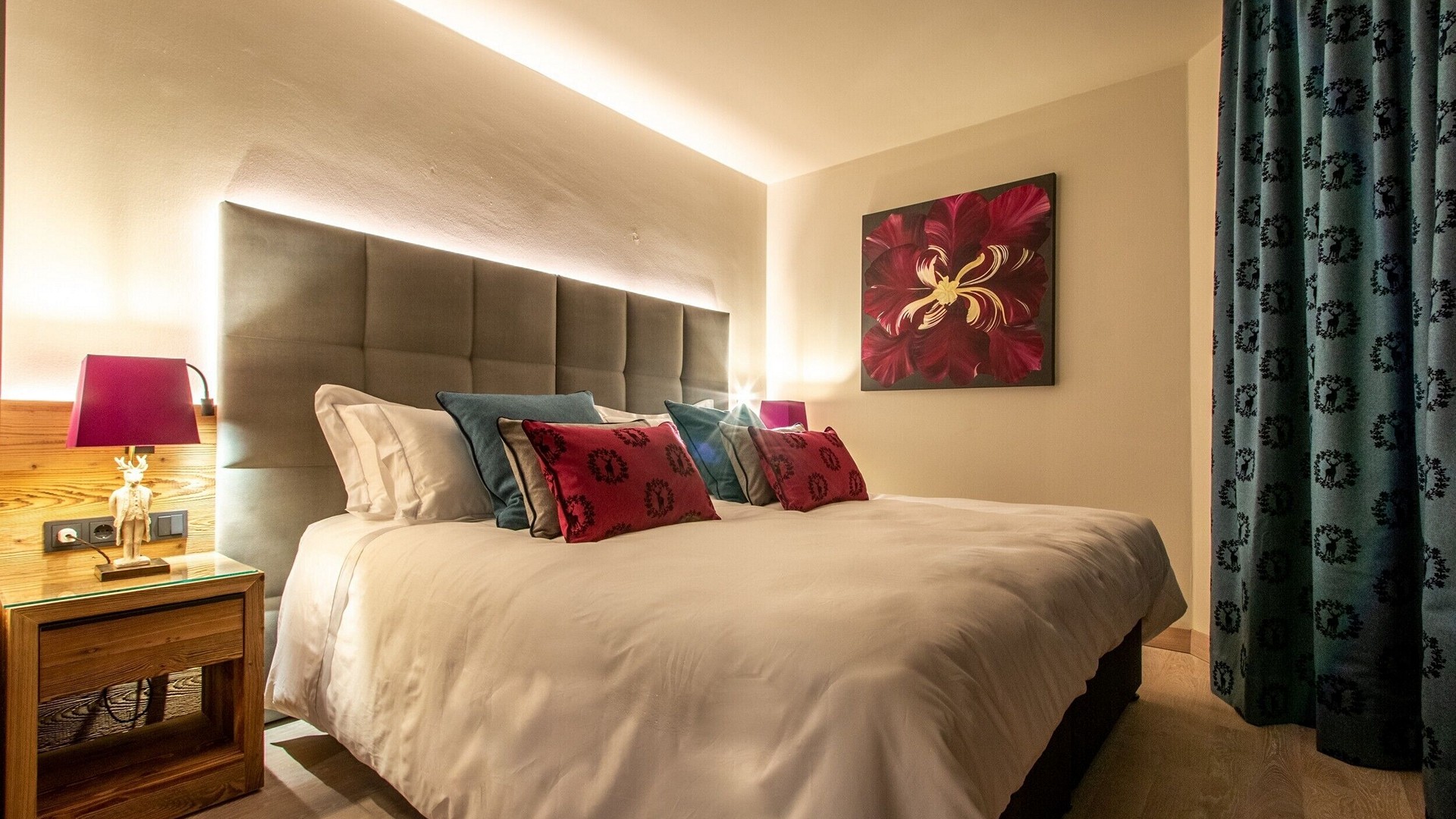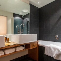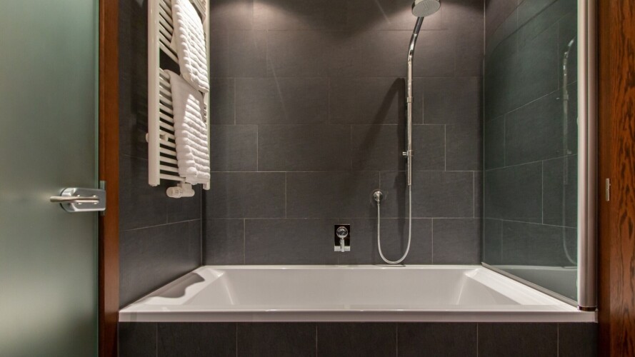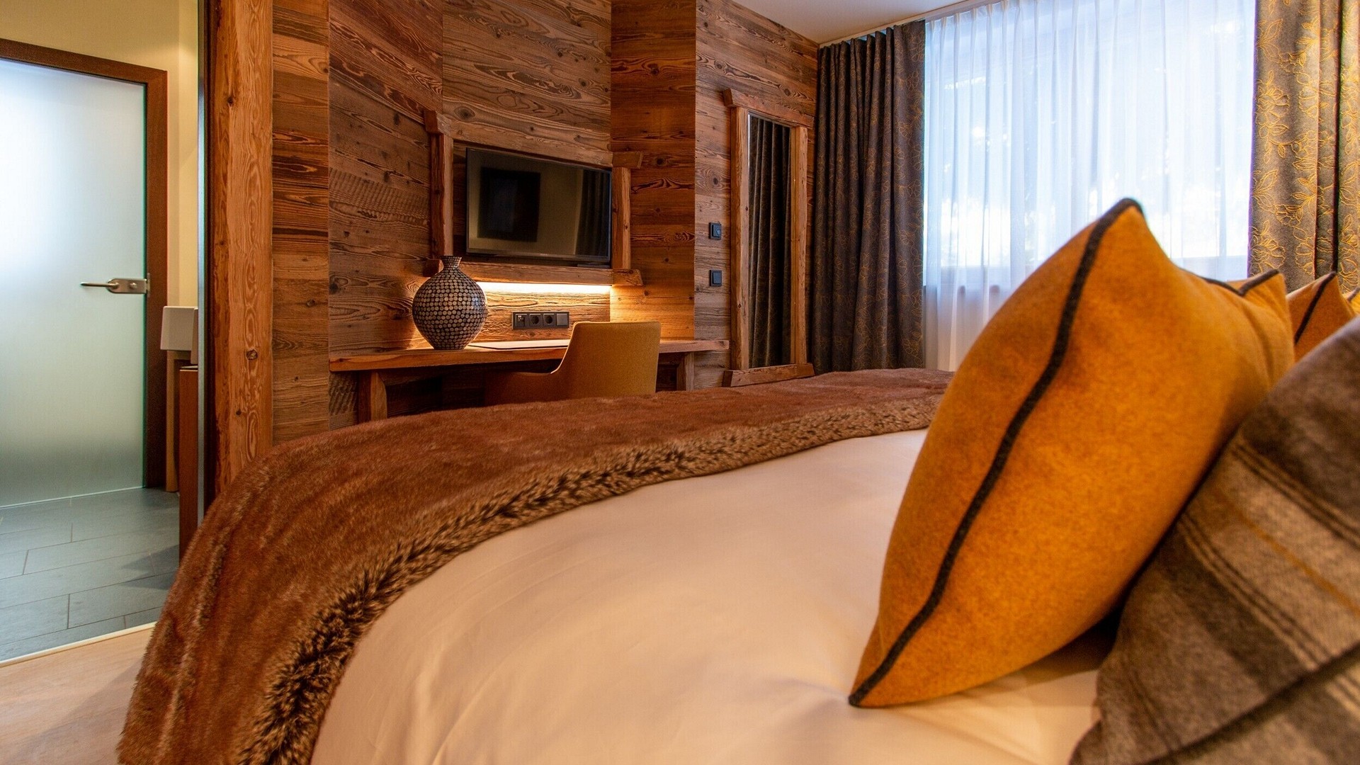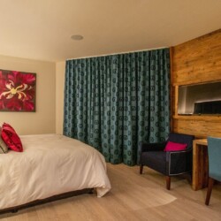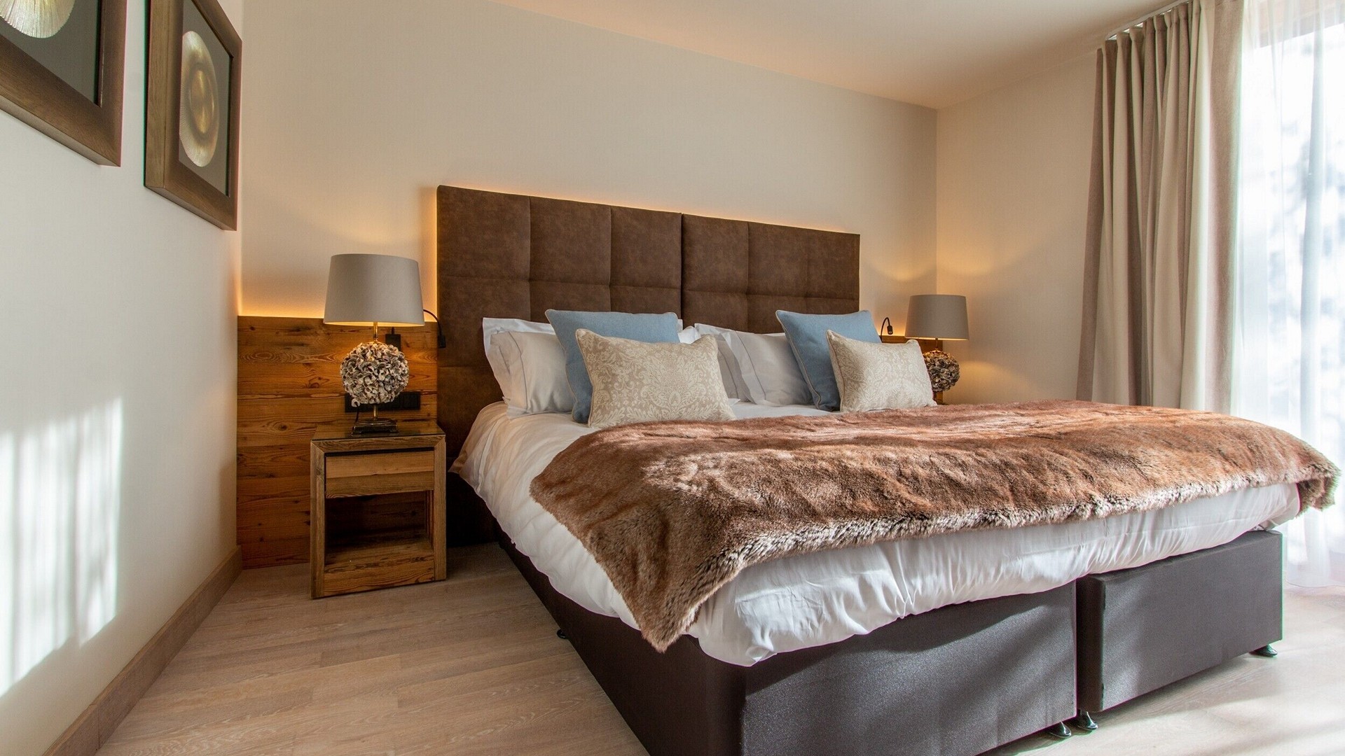 The main living area occupies the uppermost floor, providing wonderful views over the rooftops to the snow-capped mountains. Take the lift to the top and you’ll discover a bright lounge with modular sofa seating around a blazing wood fire and a stylish dining room with bar area and an impressive wine wall. Both open onto a romantic rooftop terrace that delivers wonderful mountain views.