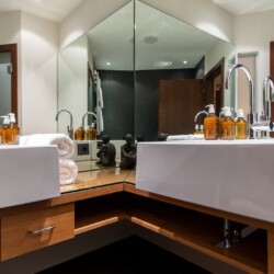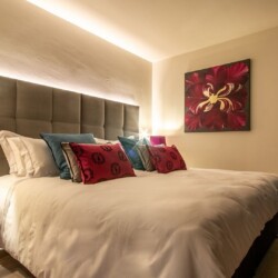 Sandwiched between the living space and the spa are two floors of bright, elegant bedrooms. Each of the six double rooms has a stylish en-suite bathroom and several enjoy a private balcony or terrace.