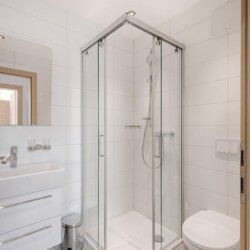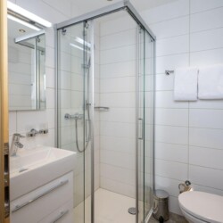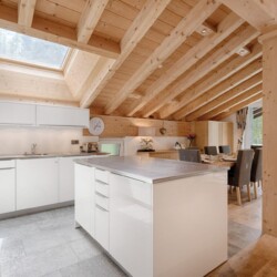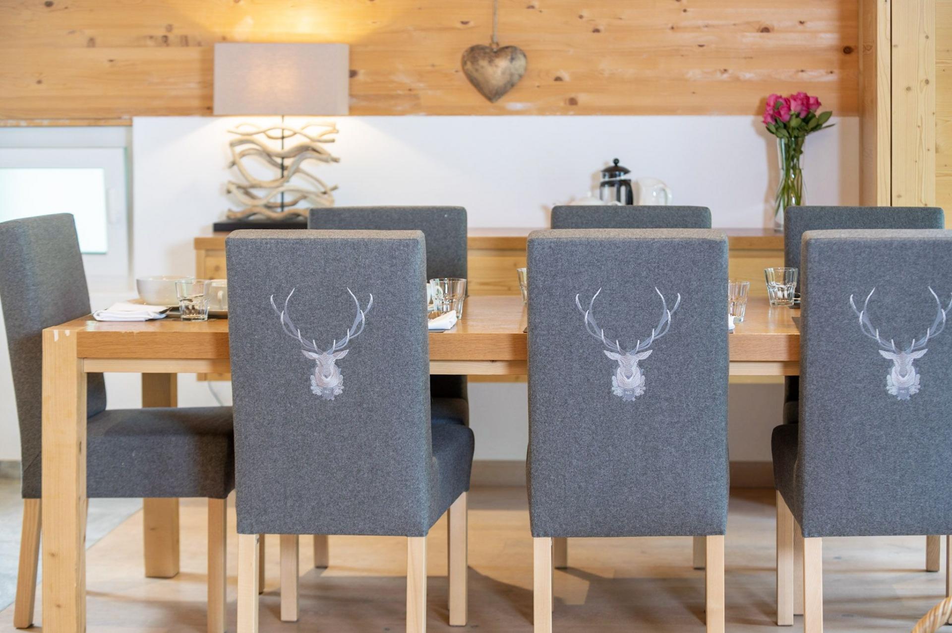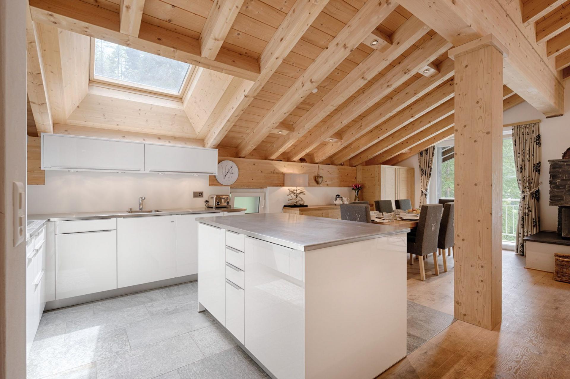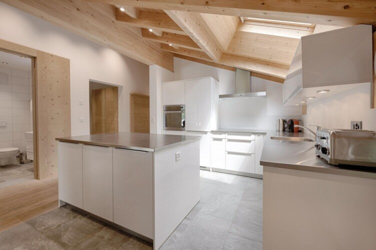 Furnished with oak wood floors, mountain spruce and modern furniture, the stylish open-plan living and dining area is the perfect spot to unwind and socialise after a day hitting the slopes of the Matterhorn Ski Paradise. A feature stone fireplace accentuates the warmth and comfort on offer at this luxury property. Tuftra Penthouse 4 has a smart modern kitchen which you can make use of or you can explore the culinary delights of the fabulous restaurants that Zermatt has to offer. A balcony off this space is a great place to enjoy an evening aperitif and take in the gorgeous panoramas of the mountains and forest.
